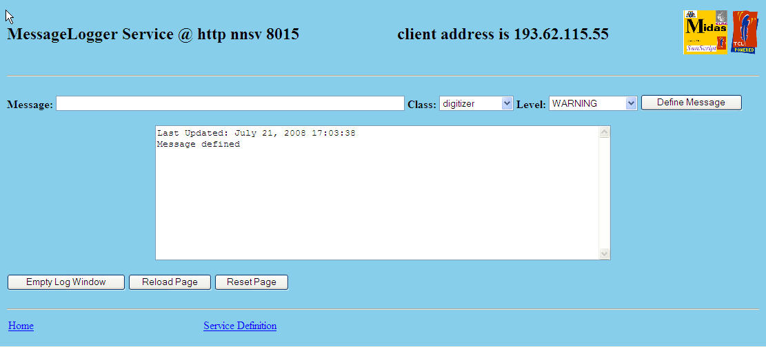 A software package is available which uses TclHttpd to implement a demonstration of the MessageLogger Service. It can be downloaded from the NPG server.