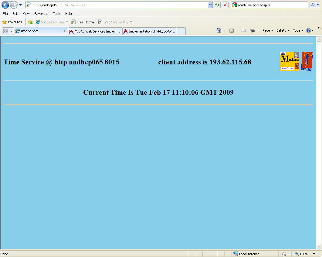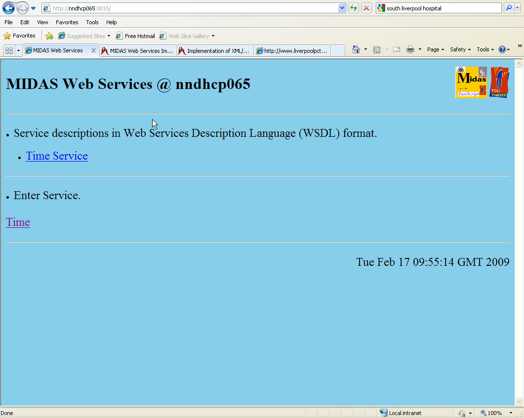 This document describes the implementation of Web Services within the MIDAS infrastructure using the TclHttpd package. Client access is possible using either a Web Browser and Html + Javascript or an application using packages based on the SOAP protocol. An simple example of a service which returns the current time is used and the necessary files required to implement this service are explained.